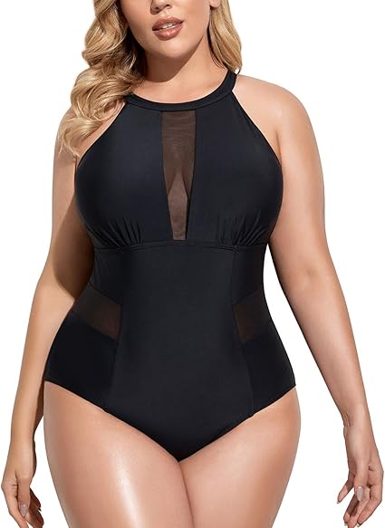 7. Daci Plus-Size One-Piece Swimsuit High-Neck Plunge Mesh