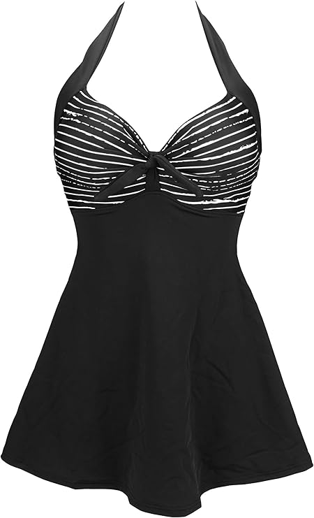 Plus-size women will surely love the support and intimacy of the LALAGEN Halter Two-Piece Swimdress because of its high-waist and cutout back designs. The tankini set bathing set has a long dress top with a halter neck that makes you slimmer in swimwear. It is 82% nylon and 18% spandex for a soft and smooth fit.